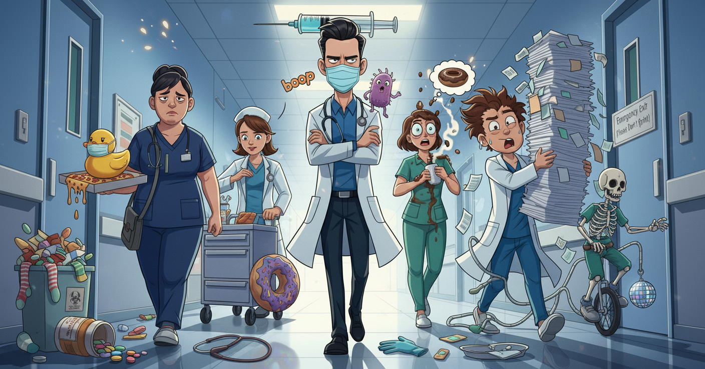 Feito de algodão leve e confortável o dia todo. A estampa ousada captura a realidade de cada turno. Projetado com um ajuste relaxado para versatilidade. Perfeito para profissionais de saúde que trabalham duro e riem ainda mais.